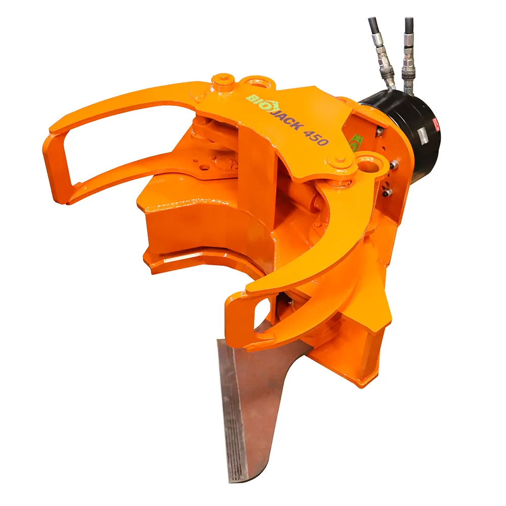 Biojack 450 er en kraftig tresaks for gravemaskiner, utviklet for tynning, trefelling, vindfallrydding og energivedhogst. Den kan både felle og laste uten ekstra tilpasninger, er enkel å montere og gir lave stubber og rene kutt – også ved arbeid nær bygninger og kraftlinjer.