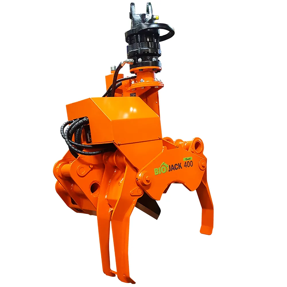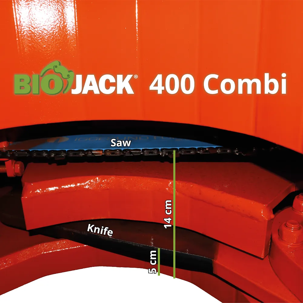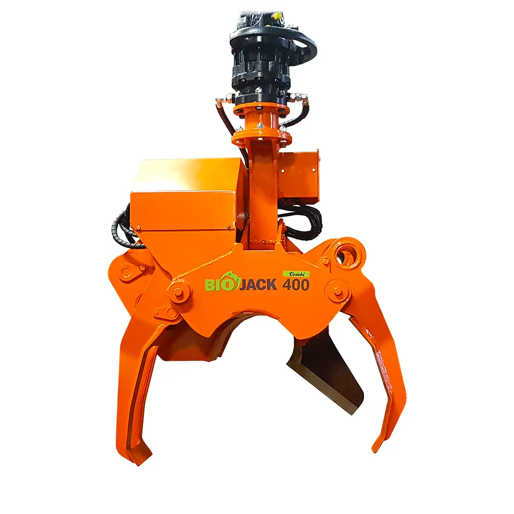 Biojack 400 Combi er en fleksibel fellegrip som kombinerer kniv og motorsag i ett redskap. Den gjør det enkelt å håndtere både små energitrær og større stammer, og egner seg godt til skogsarbeid, vedlikehold langs veier og arbeid i urbane områder.